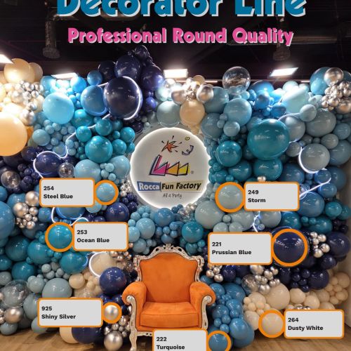 We have a wide assortment of different patterns, shapes and colors of balloons for any kind of event, for professional decorators, numbers, letters in various colors and sizes.